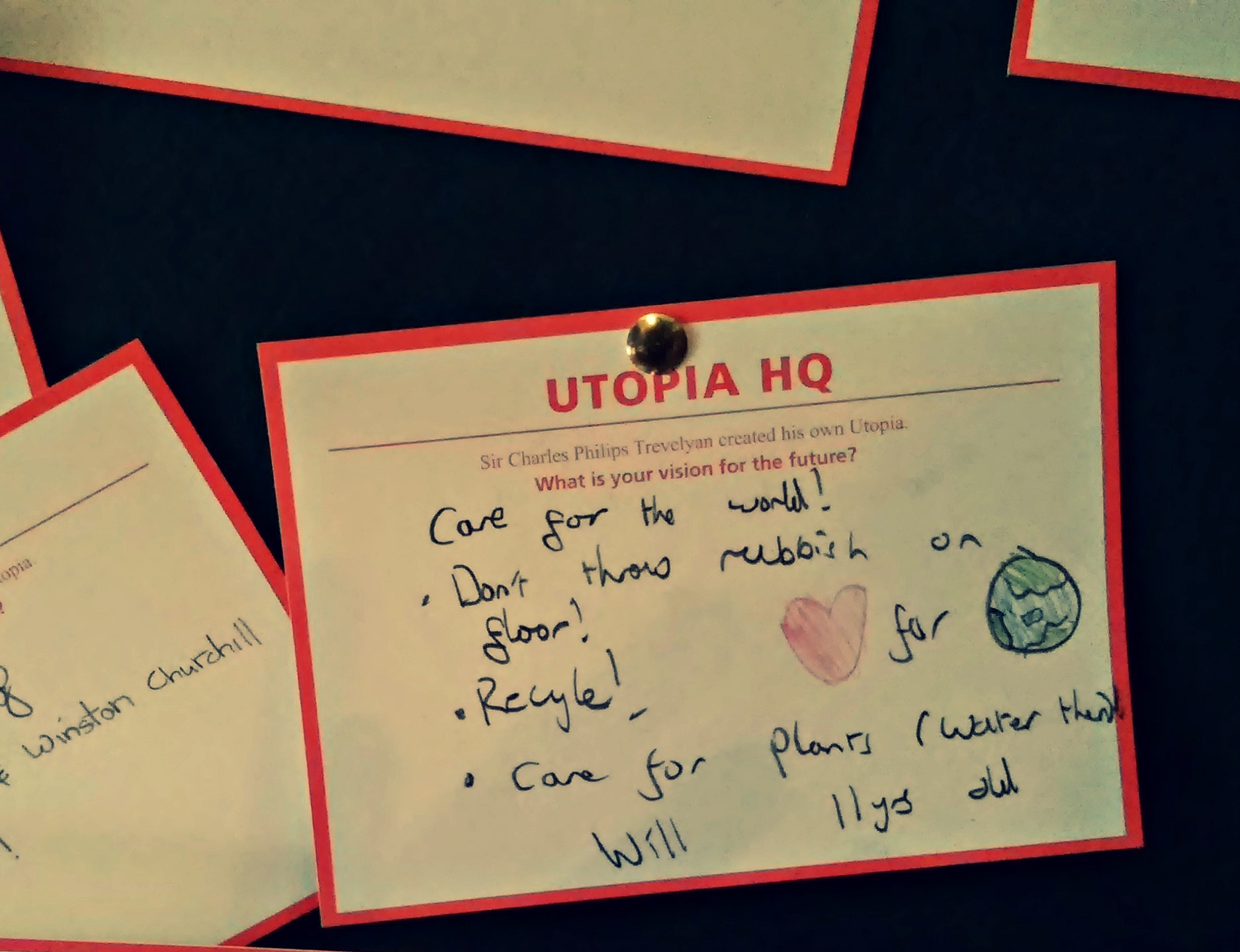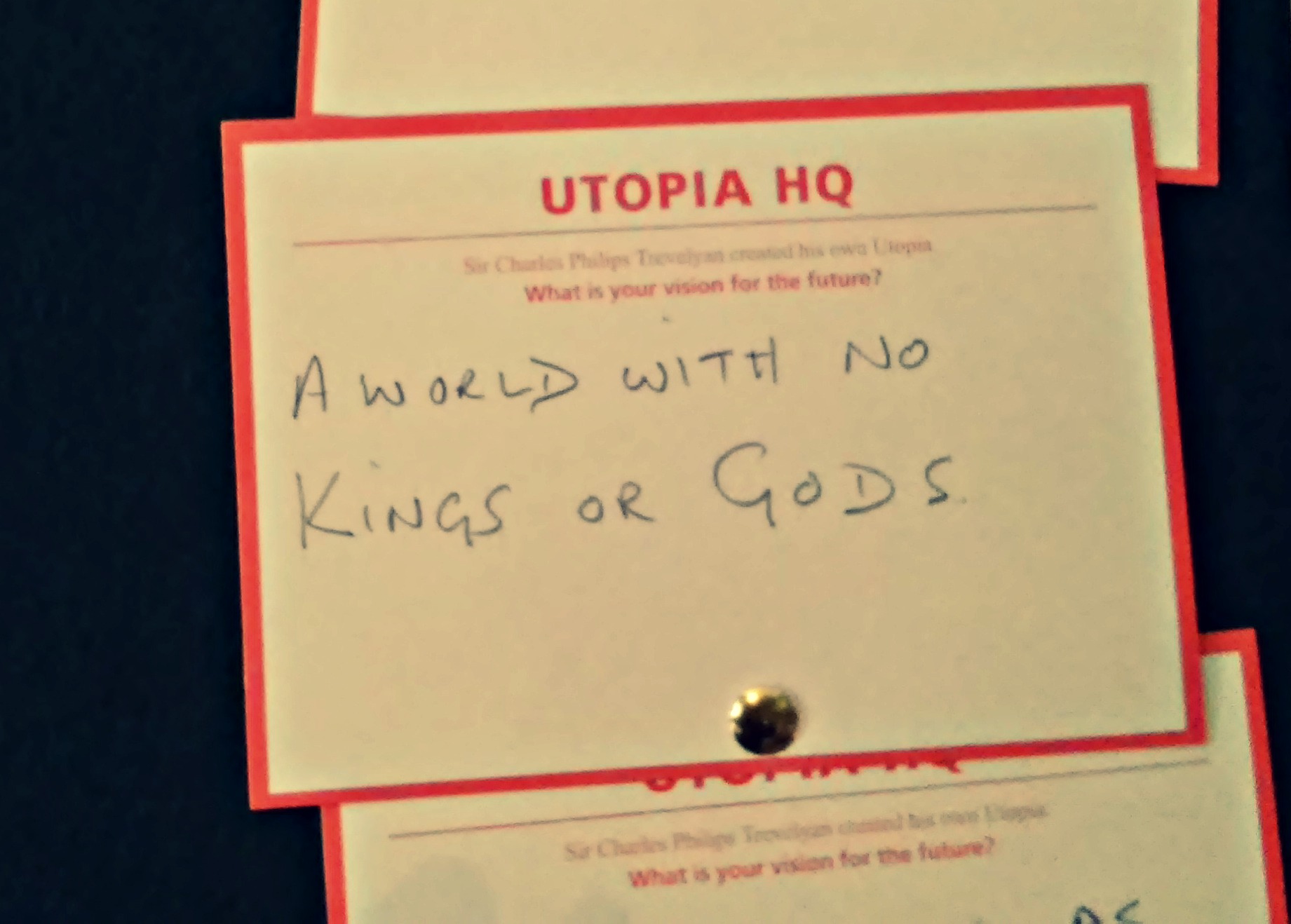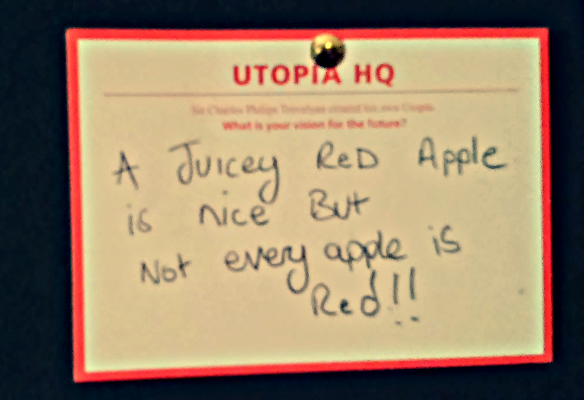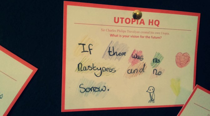 Alongside the old wooden voting booths was a large green noticeboard, and underneath it, a scattered pile of blank, red-bordered cards marked “Utopia HQ” asked visitors to Wallington “What is your vision for the future”? The answers, randomly pinned up and scattered on the table, made me laugh, feel uplifted and occasionally think “huh”? I’d love to know which is your fave – mine is definitely the one about the “ponny”! Also, can you guess which one I wrote? 🙂