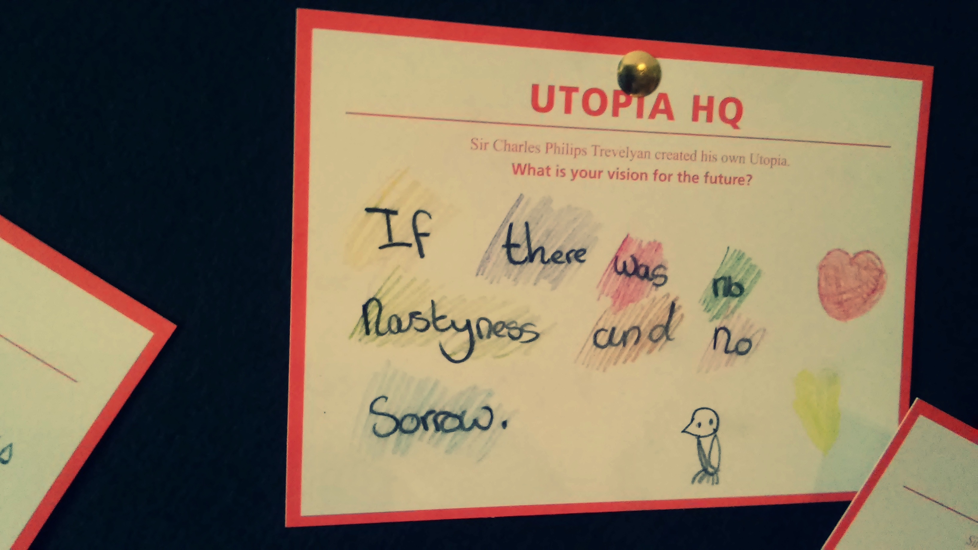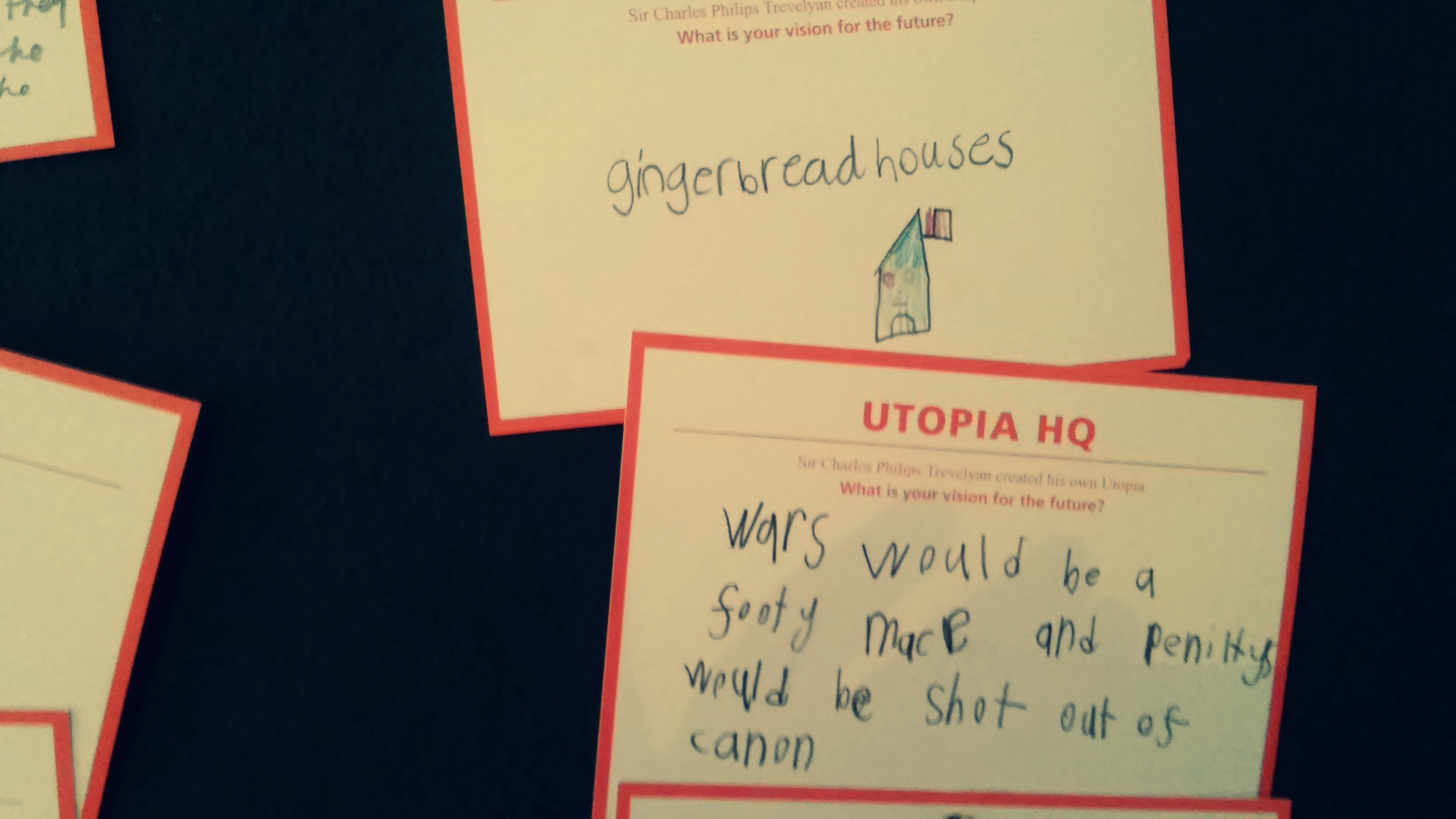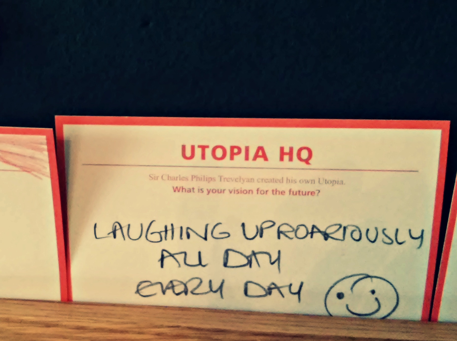 Alongside the old wooden voting booths was a large green noticeboard, and underneath it, a scattered pile of blank, red-bordered cards marked “Utopia HQ” asked visitors to Wallington “What is your vision for the future”? The answers, randomly pinned up and scattered on the table, made me laugh, feel uplifted and occasionally think “huh”? I’d love to know which is your fave – mine is definitely the one about the “ponny”! Also, can you guess which one I wrote? 🙂