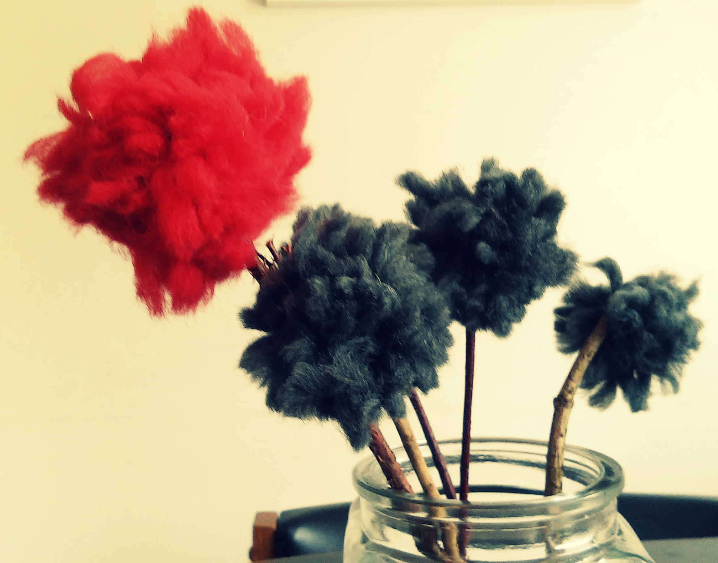 I love making pompoms, mainly for Christmas garlands, so I was very happy when I found this awesome idea for making pompom flowers, literally just with pompoms made from old wool and twigs from the garden: